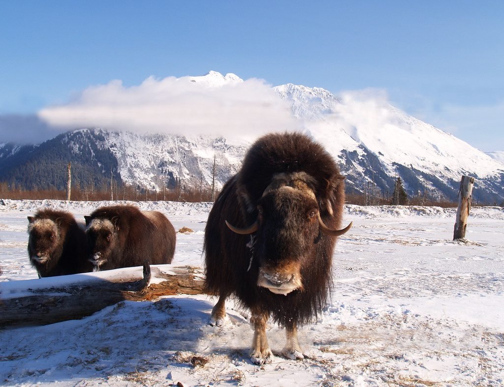 The musk ox is Greenland’s most recognizable land mammal. These large, heavy animals live in herds on the tundra, especially in East Greenland near fjords such as Scoresby Sund. They are built for cold climates, with thick coats and strong bodies that allow them to survive through winter. Musk oxen graze on grasses, moss, and low vegetation. In summer, they are often seen moving slowly across open slopes, sometimes with calves. When approached, they usually keep their distance, but a group standing in formation with glacier cliffs behind them is a classic East Greenland scene.